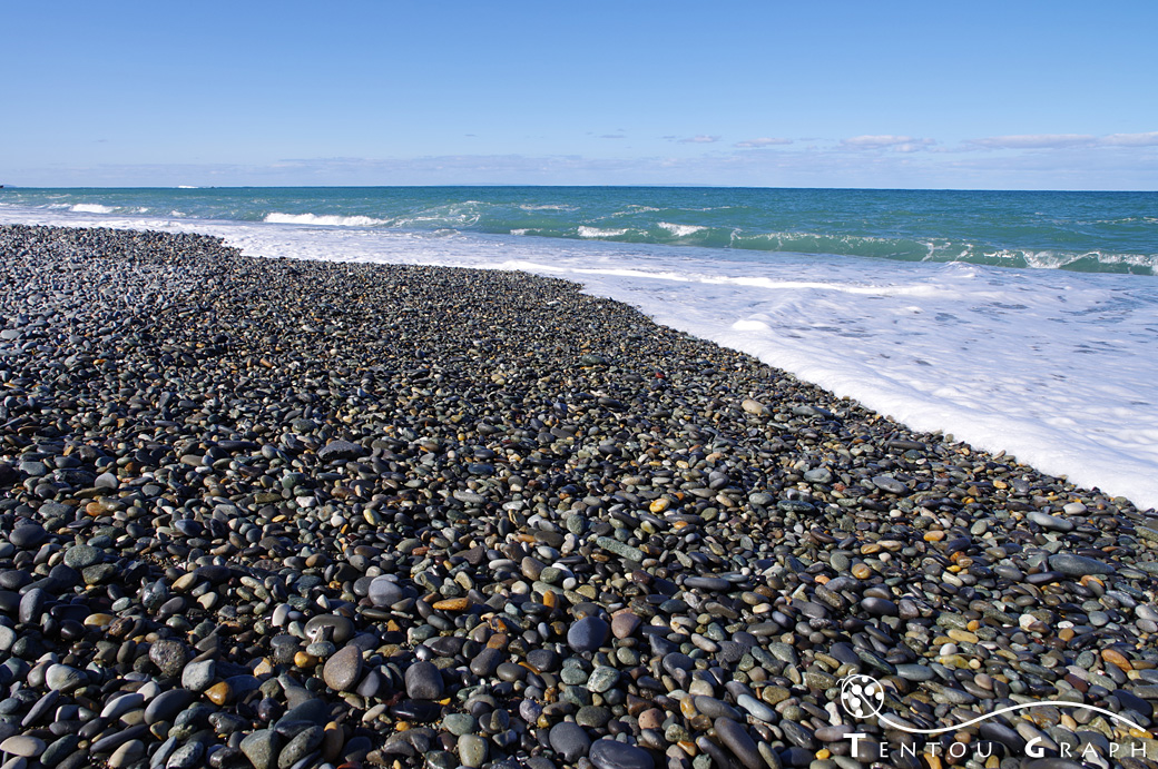 浜辺には敷き詰められたかのように美しい小石がゴロゴロしていて、波に洗われると光を反射してさらにキレイに見えます。
