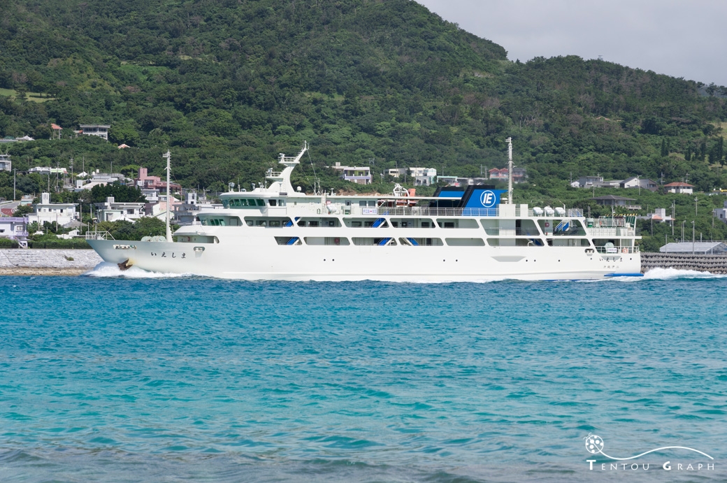 伊江島行きのフェリーが通り過ぎてゆきます。