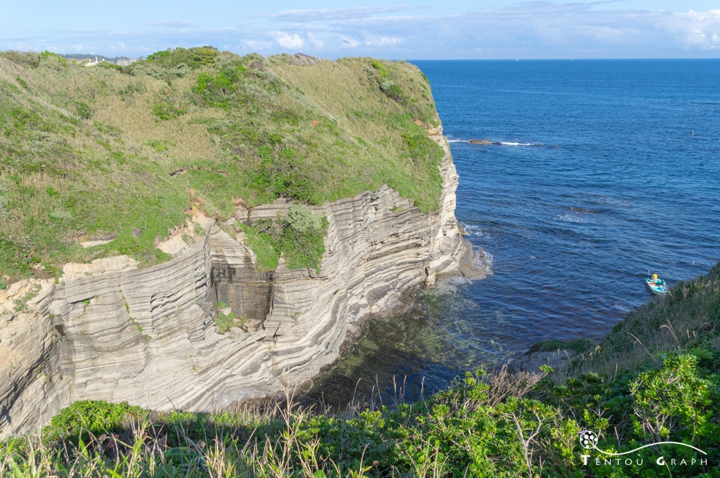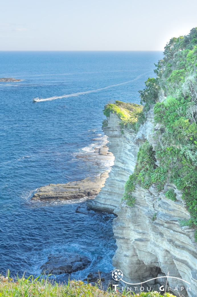 地層がくっきり見える岩肌と青い海、豊かなの緑のコントラストが美しいリアス式海岸です。